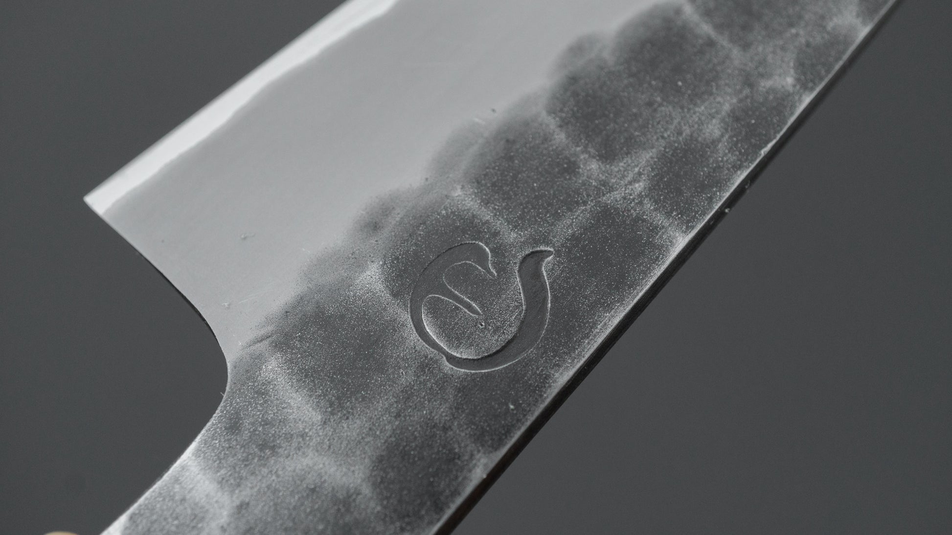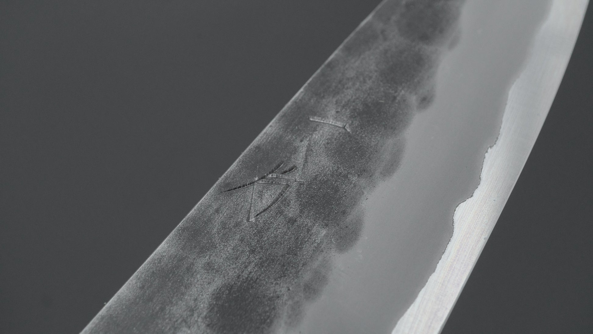 This is a carbon steel knife with a soft stainless steel cladding. Many Japanese knives are constructed with a 3-layer design known as “San Mai,” where a hard, high-quality steel core is sandwiched between two layers of softer steel or iron. In this case, the core is made of carbon steel, while the outer layers, or cladding, are composed of stainless steel. This construction combines the benefits of a carbon steel edge, such as easy sharpening and excellent edge retention, with the added corrosion resistance of stainless steel for the rest of the blade.