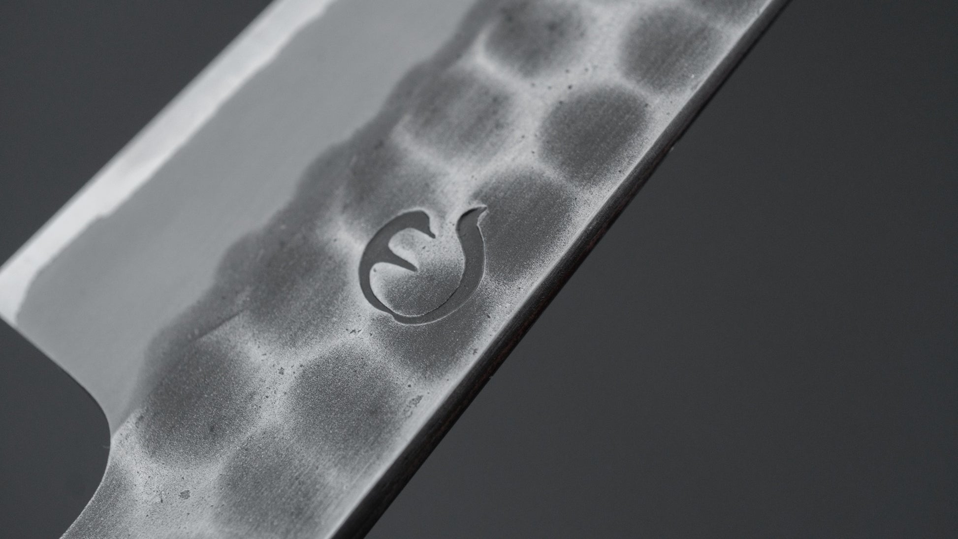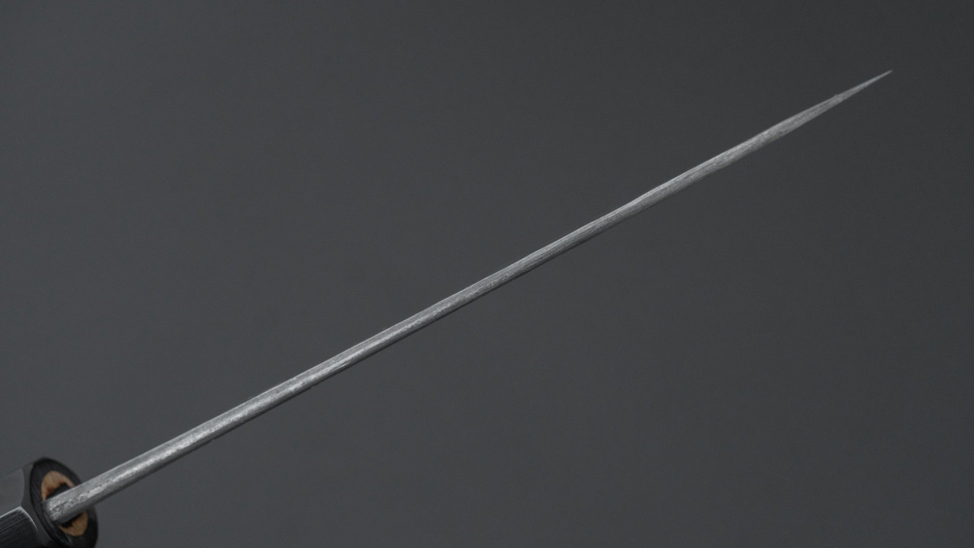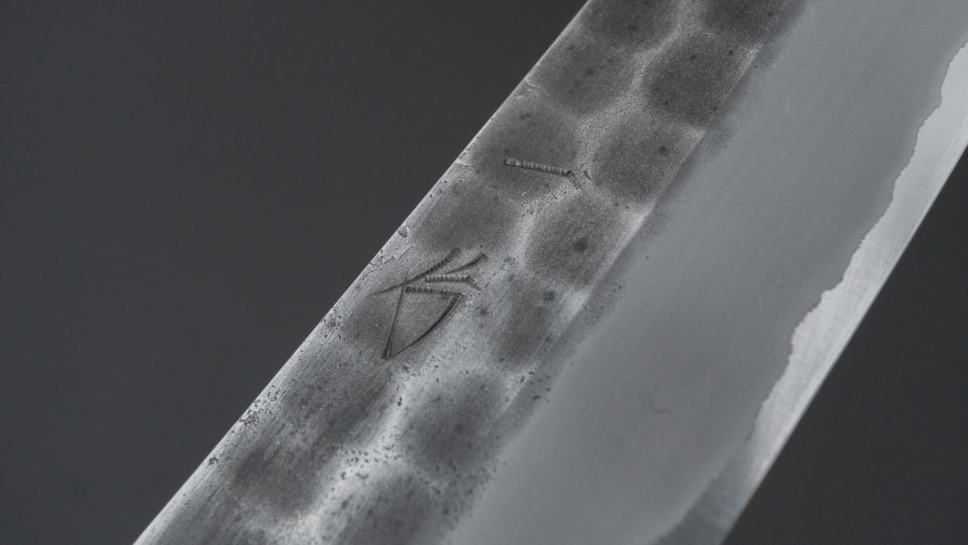 This is a carbon steel knife with a soft stainless steel cladding. Many Japanese knives are constructed with a 3-layer design known as “San Mai,” where a hard, high-quality steel core is sandwiched between two layers of softer steel or iron. In this case, the core is made of carbon steel, while the outer layers, or cladding, are composed of stainless steel. This construction combines the benefits of a carbon steel edge, such as easy sharpening and excellent edge retention, with the added corrosion resistance of stainless steel for the rest of the blade.