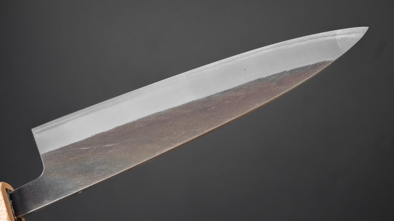 This is a carbon steel knife with a soft stainless steel cladding. Many Japanese knives are constructed with a 3-layer design known as “San Mai,” where a hard, high-quality steel core is sandwiched between two layers of softer steel or iron. In this case, the core is made of carbon steel, while the outer layers, or cladding, are composed of stainless steel. This construction combines the benefits of a carbon steel edge, such as easy sharpening and excellent edge retention, with the added corrosion resistance of stainless steel for the rest of the blade.