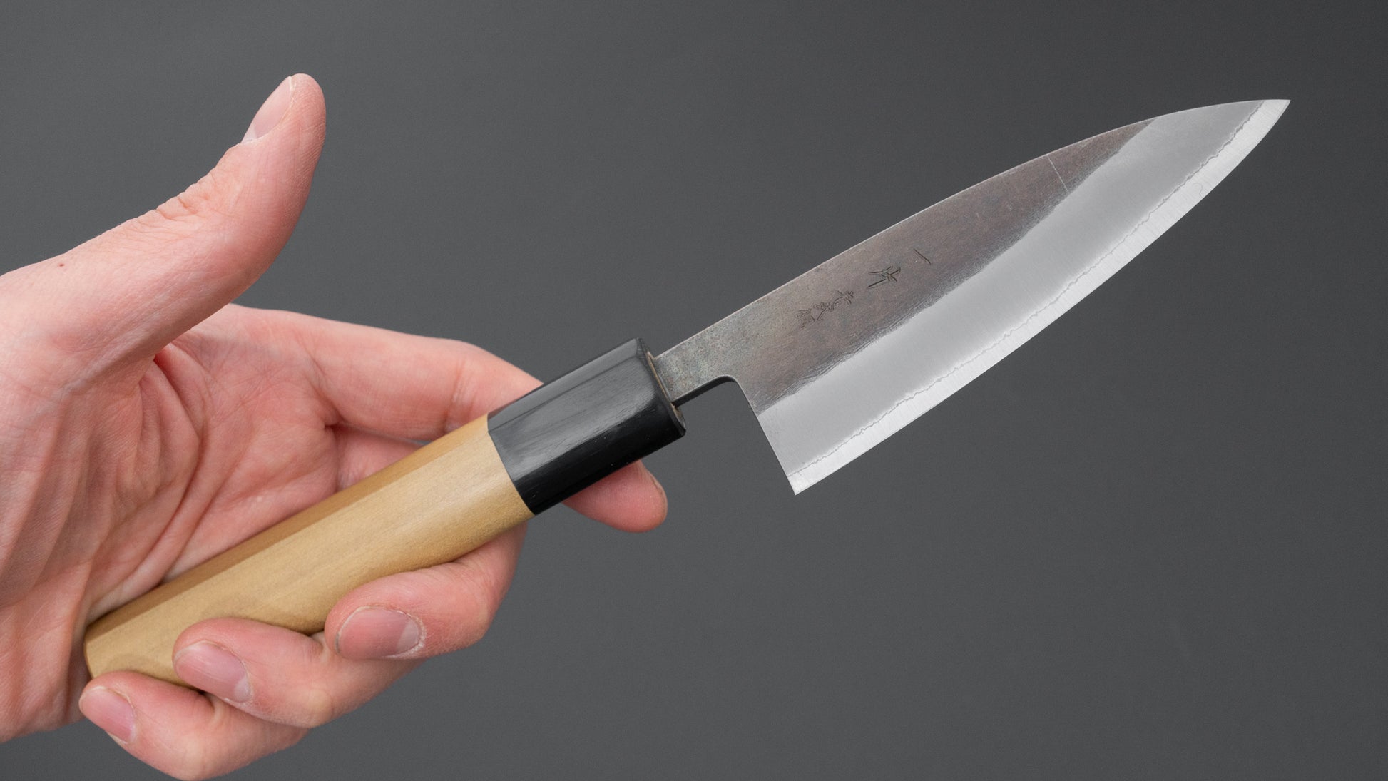 The Hitohira TD series consists of sturdy handmade knives from Sanjo, Niigata. All the knives we carry in the TD series are hand forged which makes for a noticeable improvement in steel quality. Very good prices for hand-forged knives. They come in kurouchi, tsuchime, nashiji and sometimes migaki finished stainless cladding on either Blue #2 (carbon steel) or SLD (semi stainless steel) core. Like many Sanjo made knives, they have spines that are somewhat thicker towards the neck, making for a nice grip and a little more weight. Very well made and reliable knives.