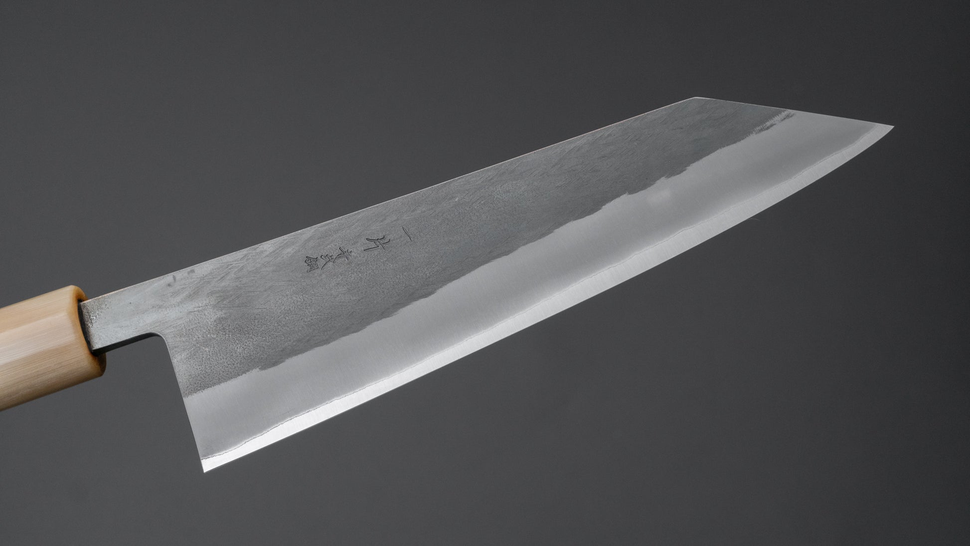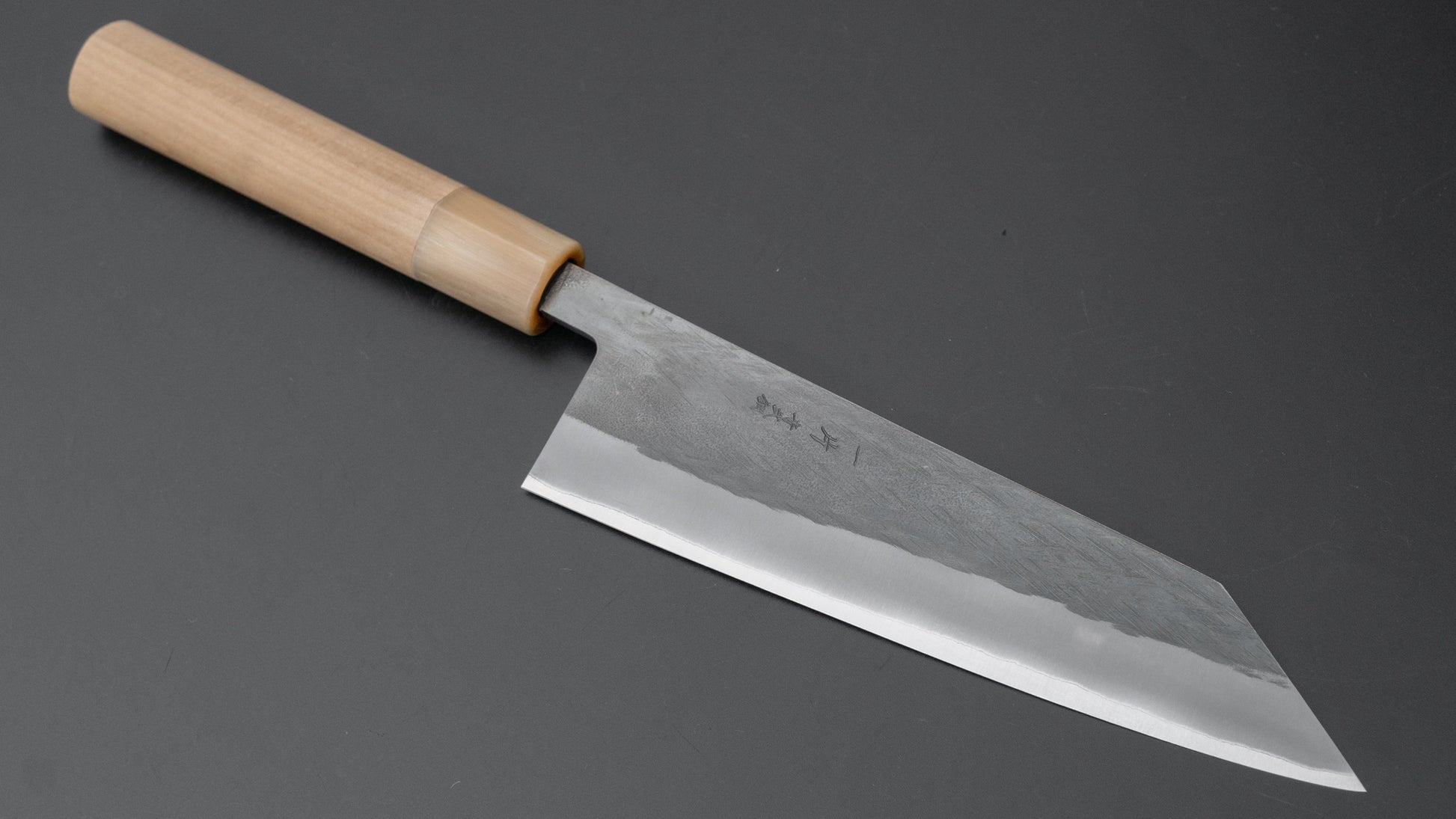The Hitohira TD series consists of sturdy handmade knives from Sanjo, Niigata. All the knives we carry in the TD series are hand forged which makes for a noticeable improvement in steel quality. Very good prices for hand-forged knives. They come in kurouchi, tsuchime, nashiji and sometimes migaki finished stainless cladding on either Blue #2 or SLD core steel. Like many Sanjo made knives, they have spines that are somewhat thicker towards the neck, making for a nice grip and a little more weight. Very well made and dependable knives.