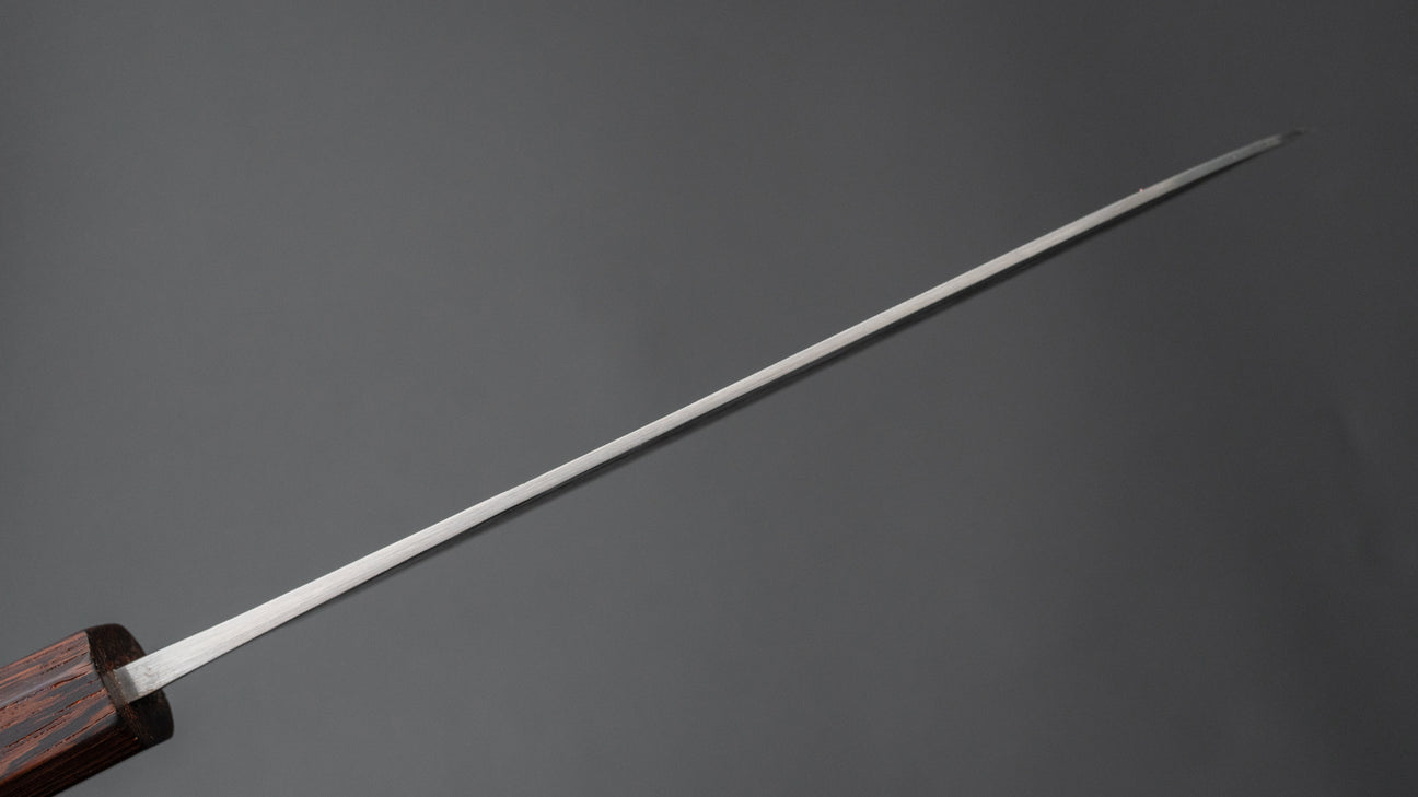The Hitohira TD series consists of sturdy handmade knives from Sanjo, Niigata. All the knives we carry in the TD series are hand forged which makes for a noticeable improvement in steel quality. Very good prices for hand-forged knives. They come in kurouchi, tsuchime, nashiji and sometimes migaki finished stainless cladding on either Blue #2 or SLD core steel. Like many Sanjo made knives, they have spines that are somewhat thicker towards the neck, making for a nice grip and a little more weight. Very well made and dependable knives.