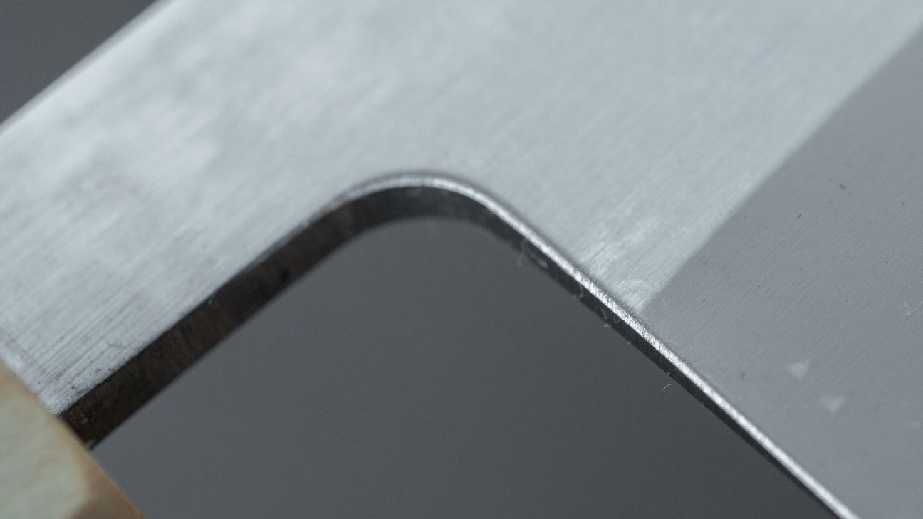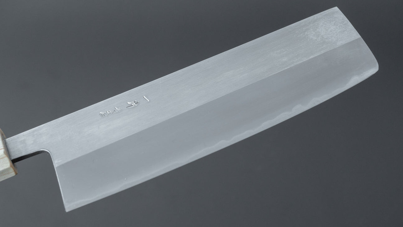 This is a carbon steel knife with a soft stainless steel cladding. Many Japanese knives are constructed with a 3-layer design known as “San Mai,” where a hard, high-quality steel core is sandwiched between two layers of softer steel or iron. In this case, the core is made of carbon steel, while the outer layers, or cladding, are composed of stainless steel. This construction combines the benefits of a carbon steel edge, such as easy sharpening and excellent edge retention, with the added corrosion resistance of stainless steel for the rest of the blade.