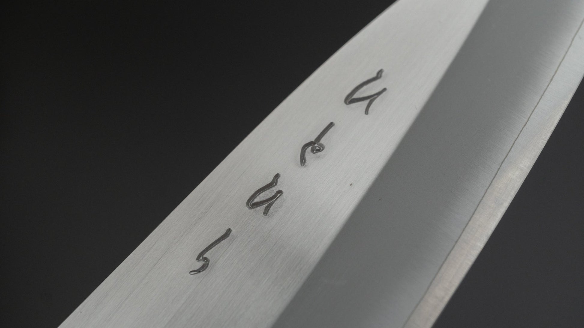 The Hitohira TD series consists of sturdy handmade knives from Sanjo, Niigata. All the knives we carry in the TD series are hand forged which makes for a noticeable improvement in steel quality. Very good prices for hand-forged knives. They come in kurouchi, tsuchime, nashiji and sometimes migaki finished stainless cladding on either Blue #2 or SLD core steel. Like many Sanjo made knives, they have spines that are somewhat thicker towards the neck, making for a nice grip and a little more weight. Very well made and dependable knives.