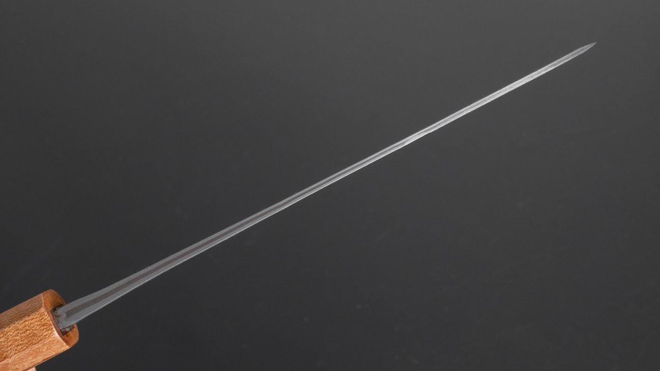 The Hitohira TD series consists of sturdy handmade knives from Sanjo, Niigata. All the knives we carry in the TD series are hand forged which makes for a noticeable improvement in steel quality. Very good prices for hand-forged knives. They come in kurouchi, tsuchime, nashiji and sometimes migaki finished stainless cladding on either Blue #2 or SLD core steel. Like many Sanjo made knives, they have spines that are somewhat thicker towards the neck, making for a nice grip and a little more weight. Very well made and dependable knives.