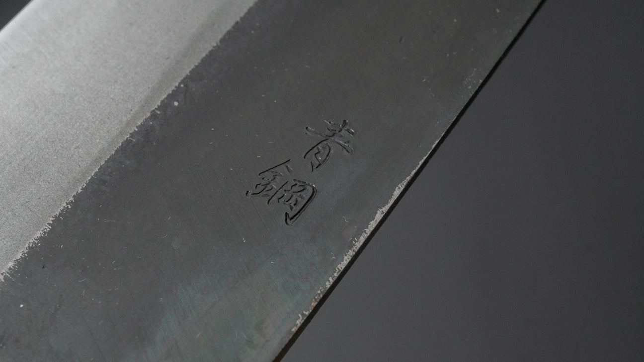 This is a carbon steel knife. Carbon steel is a non-stainless steel that lacks sufficient chromium and/or nickel to protect it from oxidation. As a result, it reacts to moisture and oxygen. While this may sound like a downside, it’s actually a key feature. Carbon steel forms a unique patina over time, is easy to sharpen, and offers excellent edge retention.
