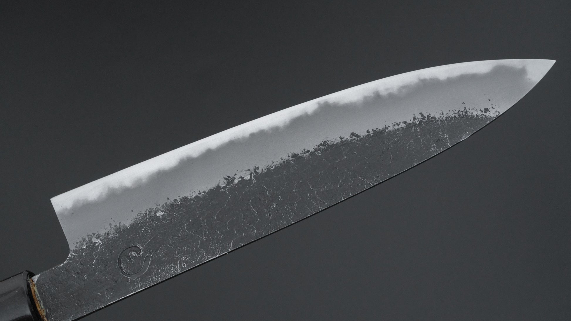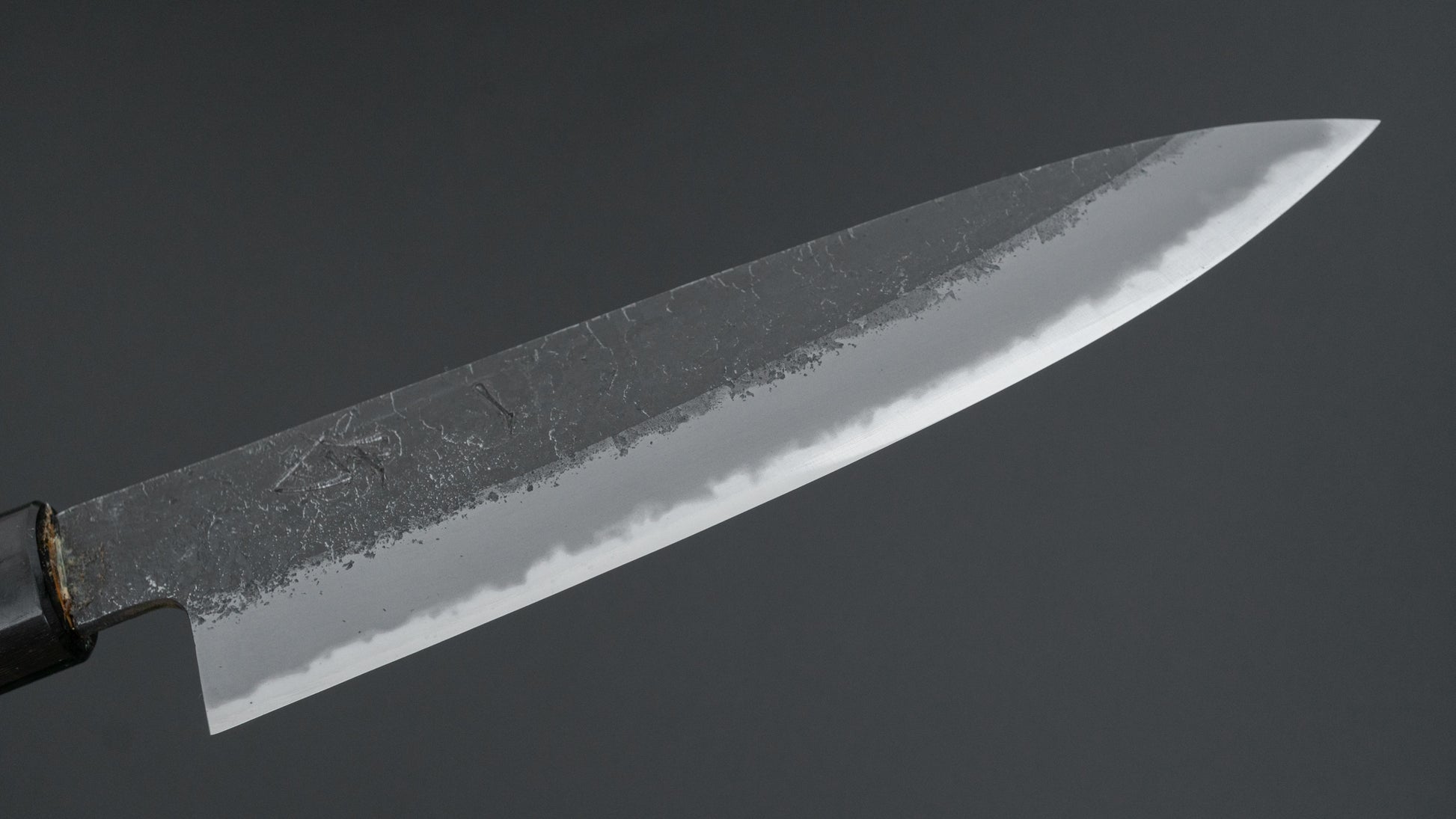 The Hitohira Hinode and Ajikataya series are forged by Sanjo based blacksmith Mutsumi Hinoura. He is the 4th generation blacksmith in the Hinoura family and trained under his father, the highly esteemed master blacksmith Tsukasa Hinoura. He runs a beautifully clean and organized workshop. The blades feature a tsuchime, nashiji or smooth kurouchi finish as is characteristic for Sanjo style knives. His kurouchi is very long lasting and greatly reduces oxidation on the carbon steel blades. The spine is somewhat thick, but tapers down to a very thin tip and similarly towards the edge.
