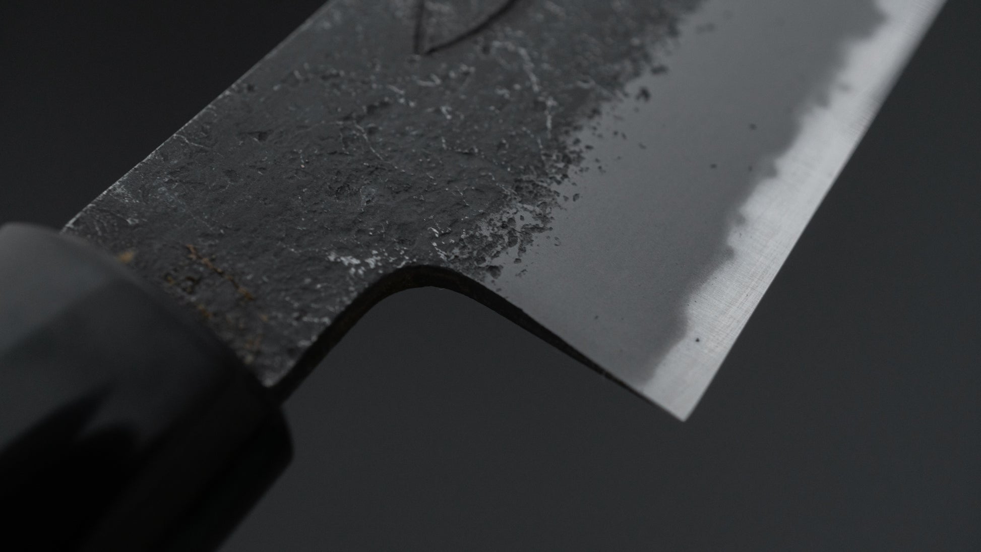 This is a carbon steel knife. Carbon steel is a non-stainless steel that lacks sufficient chromium and/or nickel to protect it from oxidation. As a result, it reacts to moisture and oxygen. While this may sound like a downside, it’s actually a key feature. Carbon steel forms a unique patina over time, is easy to sharpen, and offers excellent edge retention.