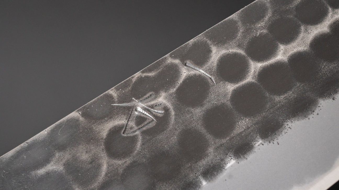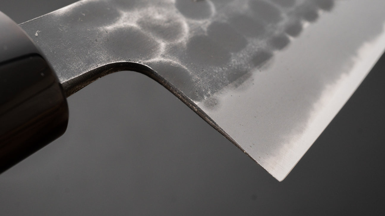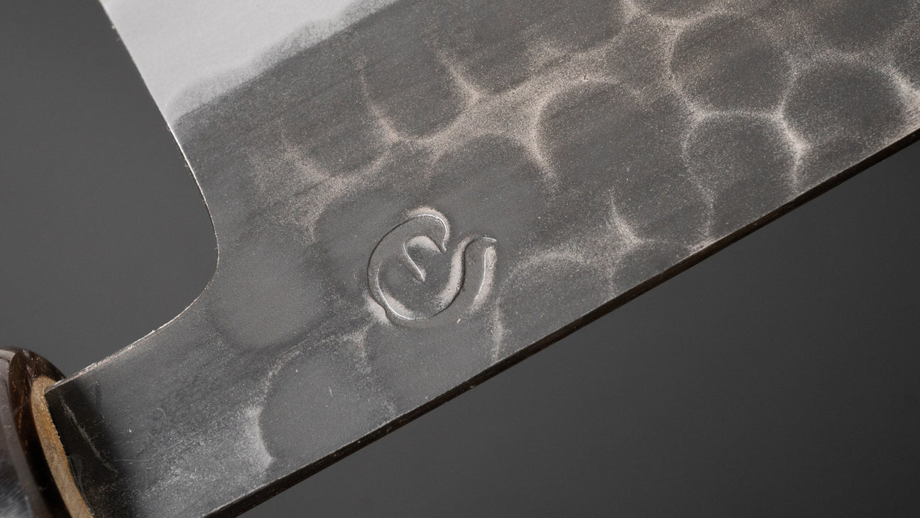 The Hitohira Hinode and Ajikataya series are forged by Sanjo based blacksmith Mutsumi Hinoura. He is the 4th generation blacksmith in the Hinoura family and trained under his father, the highly esteemed master blacksmith Tsukasa Hinoura. He runs a beautifully clean and organized workshop. The blades feature a tsuchime, nashiji or smooth kurouchi finish as is characteristic for Sanjo style knives. His kurouchi is very long lasting and greatly reduces oxidation on the carbon steel blades. The spine is somewhat thick, but tapers down to a very thin tip and similarly towards the edge.