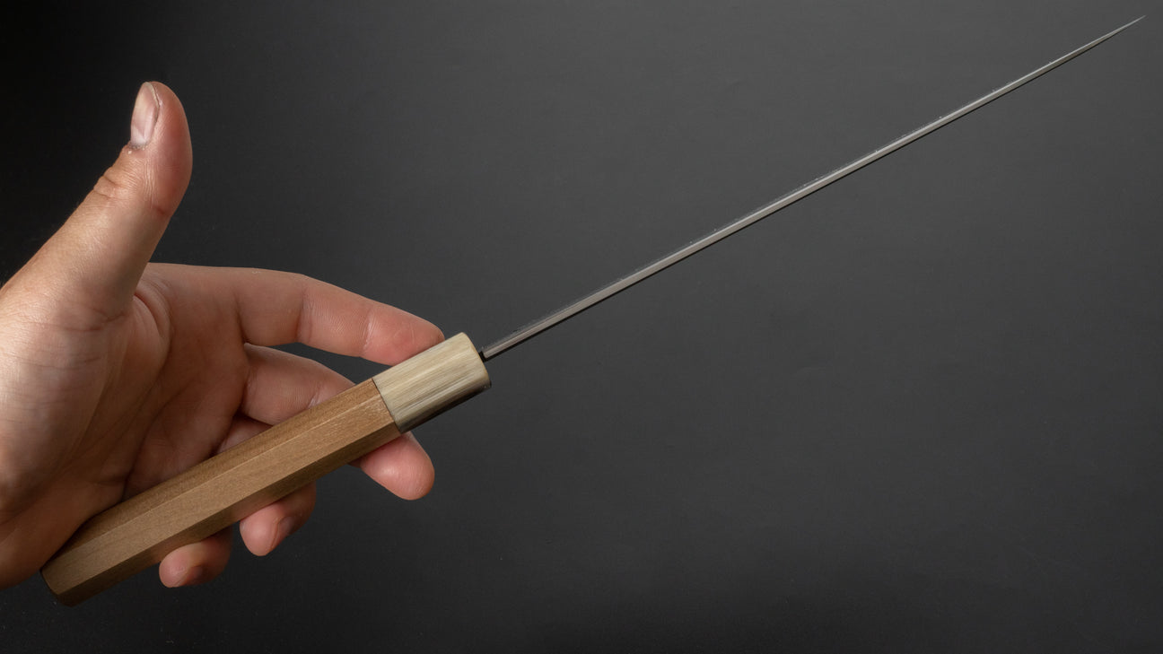 Tetsujin is the brand name for knives made by blacksmith Toru Tamura and sharpener Naohito Myojin. Two highly skilled perfectionist craftsmen and both some of the finest artisans of their generation. Tomura Sans blue steel has a hardness of around 63-64 HRC, very resilient to chipping and easy to touch up and with excellent edge retention.