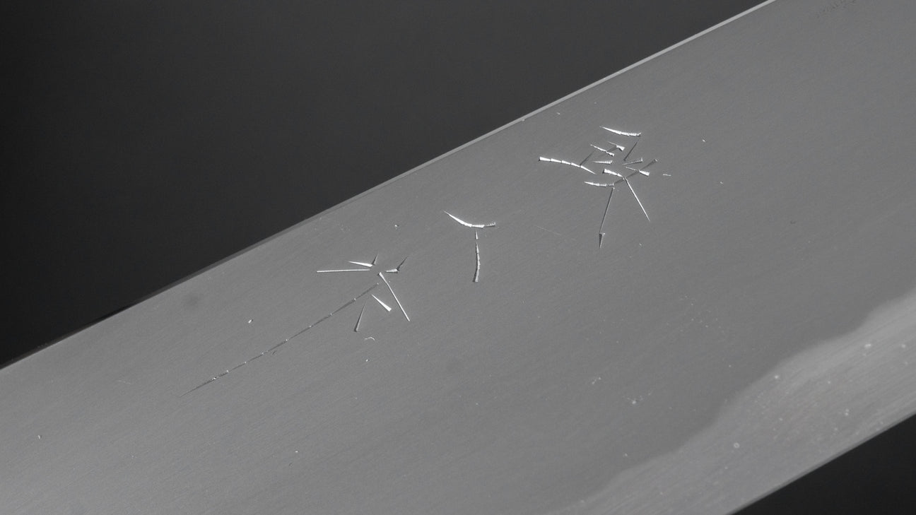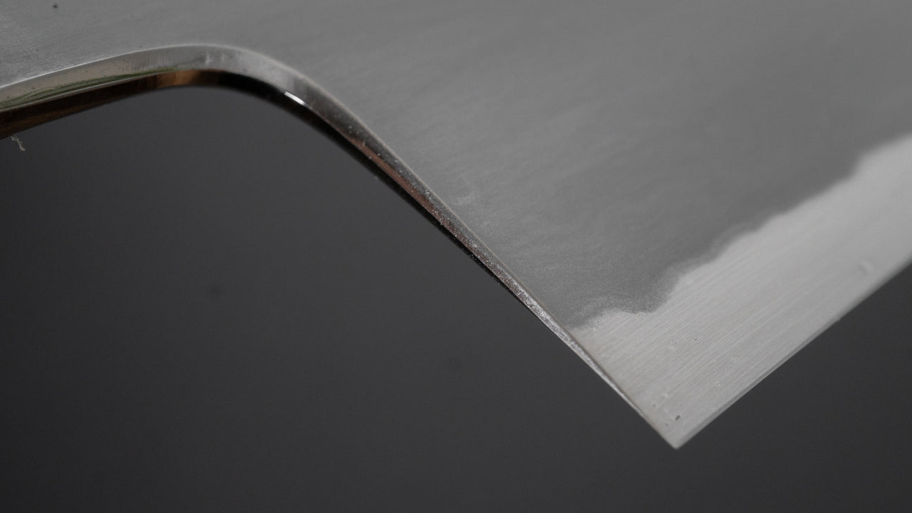 Myojin Sans sharpening is characterized by very even, thin convex (hamaguri) bevels, superior cutting performance, strong geometry and outstanding polish.