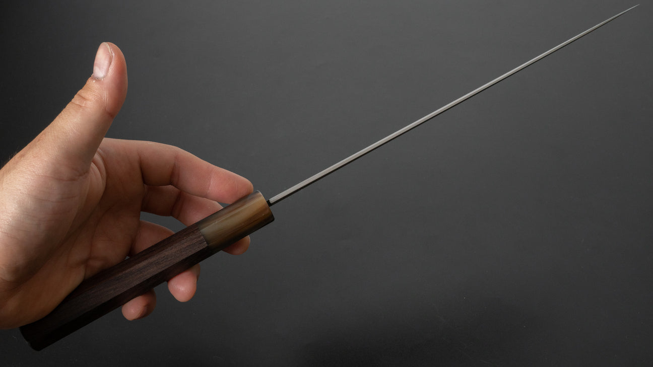 Tetsujin is the brand name for knives made by blacksmith Toru Tamura and sharpener Naohito Myojin. Two highly skilled perfectionist craftsmen and both some of the finest artisans of their generation. Tomura Sans blue steel has a hardness of around 63-64 HRC, very resilient to chipping and easy to touch up and with excellent edge retention.
