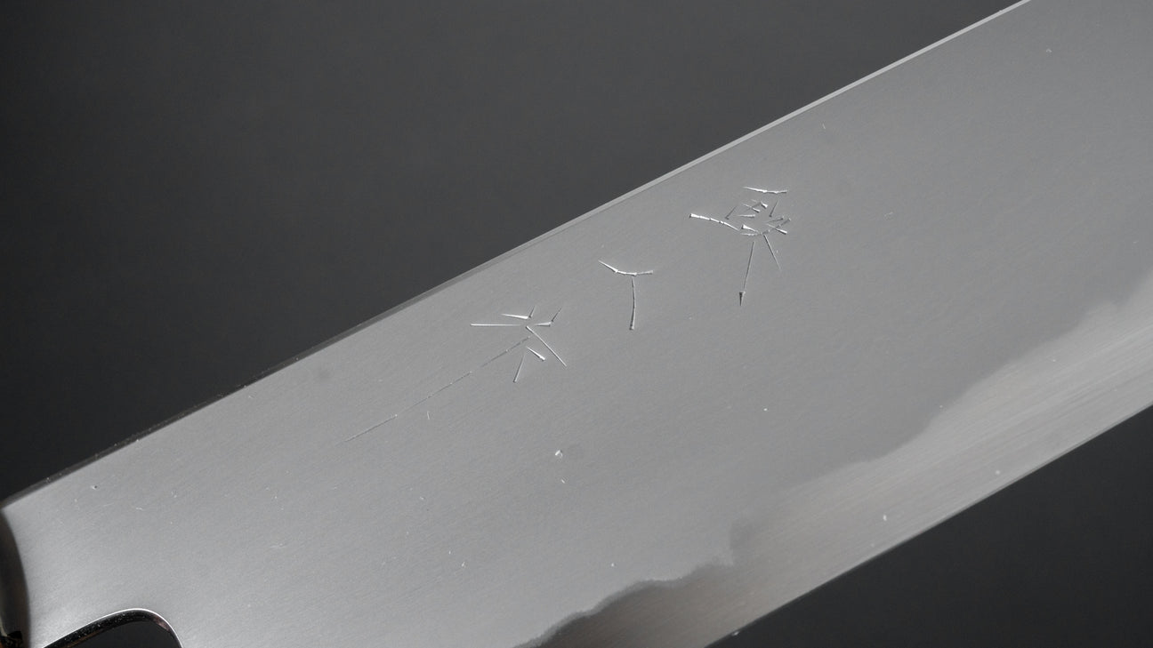 Silver steel is the newest edition to the Tetsujin range. High hardness (63+) with superb sharpening ability and edge formation. The Silver steel series features two different finishes; Kasumi and Ukiba. Kasumi is the standard finish similar to the blue steel with shiny core and mat soft cladding. Ukiba is a different scratch pattern going from handle to tip with shiny cladding.
