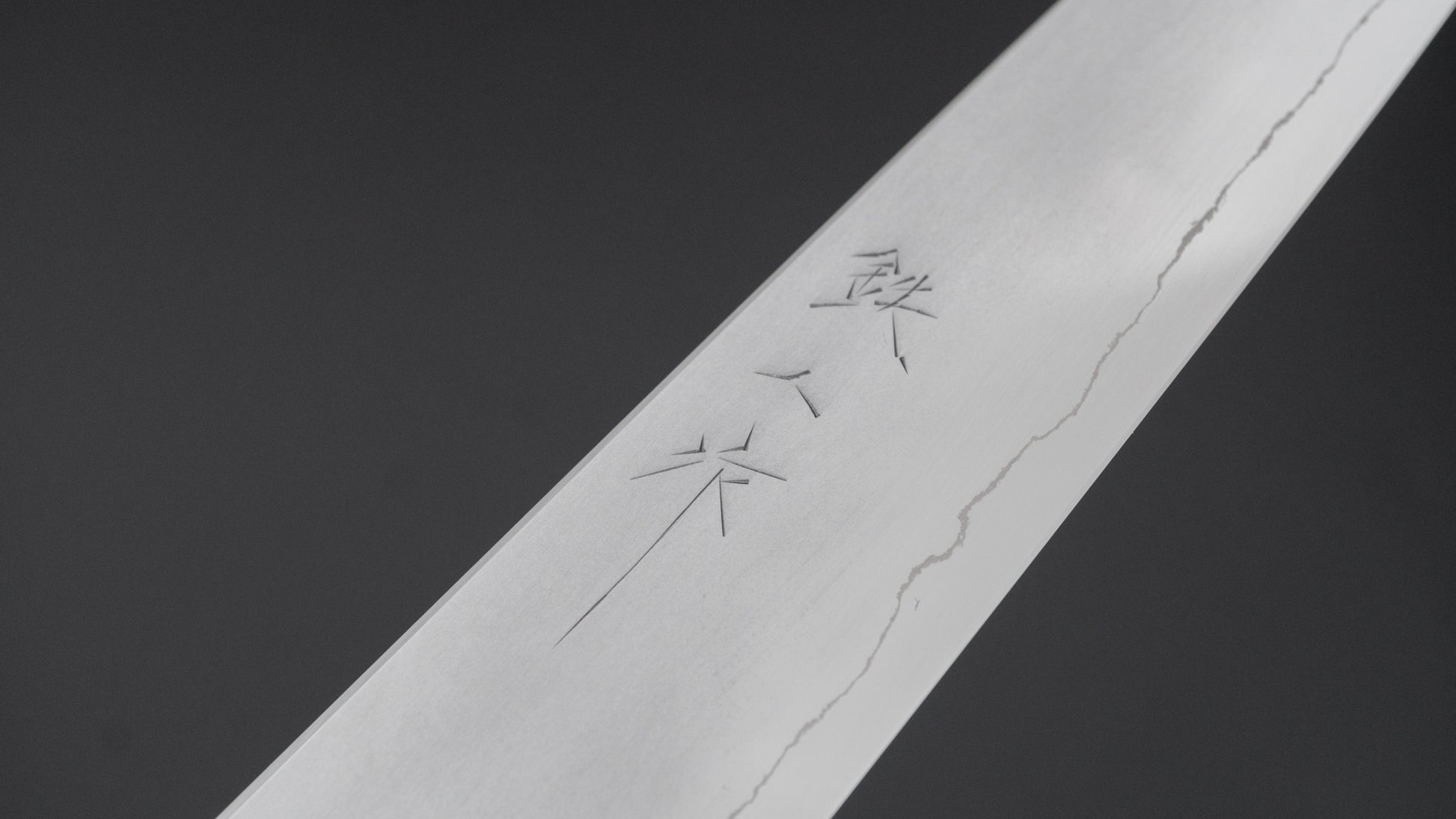 Myojin Sans sharpening is characterized by very even, thin convex (hamaguri) bevels, superior cutting performance, strong geometry and outstanding polish.