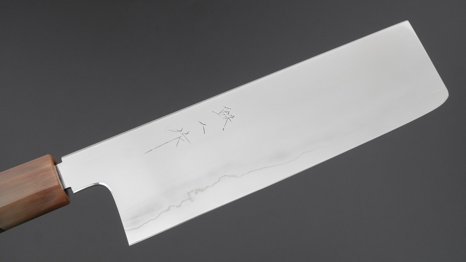 Silver steel is the newest edition to the Tetsujin range. High hardness (63+) with superb sharpening ability and edge formation. The Silver steel series features two different finishes; Kasumi and Ukiba. Kasumi is the standard finish similar to the blue steel with shiny core and mat soft cladding. Ukiba is a different scratch pattern going from handle to tip with shiny cladding.