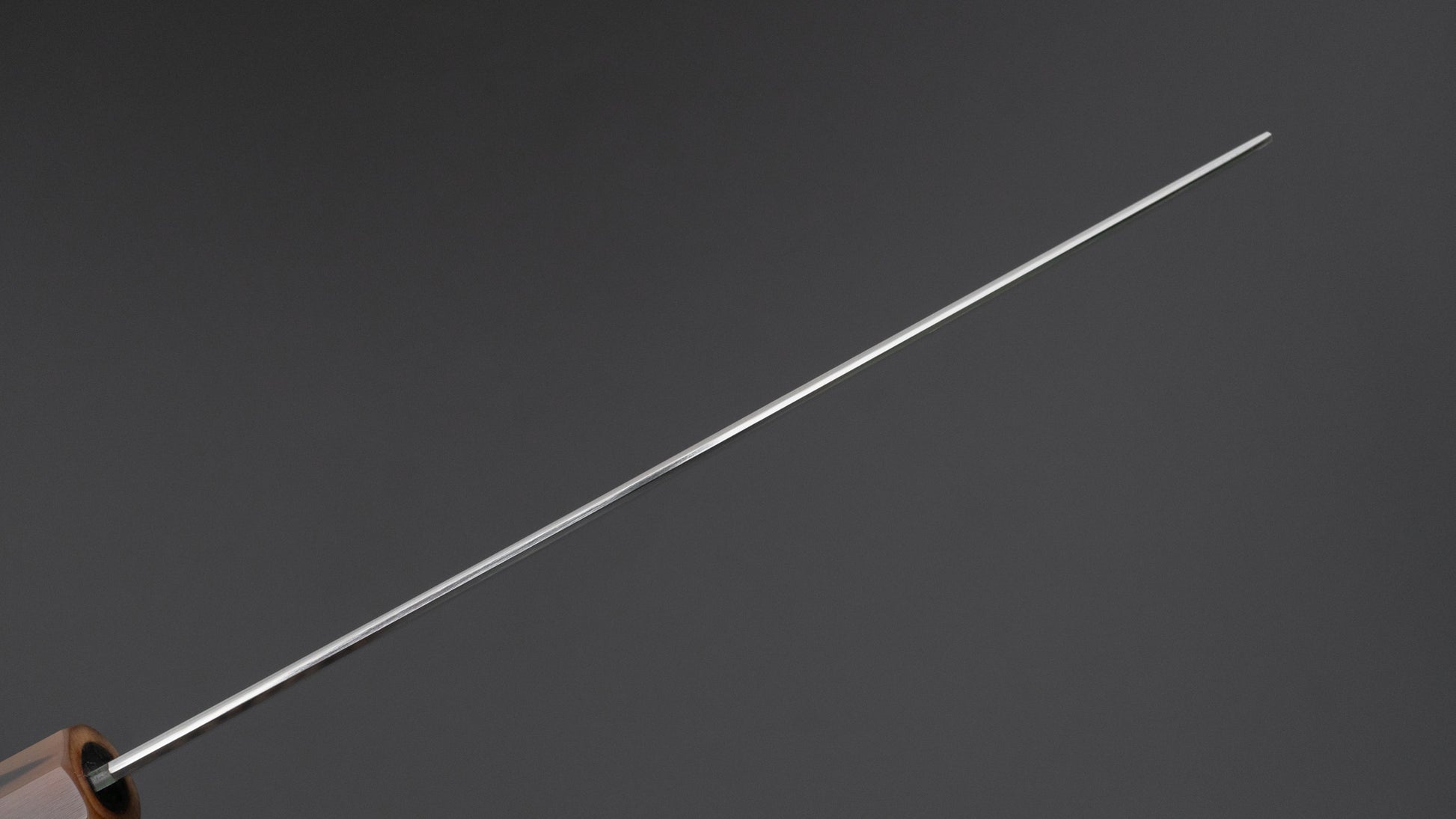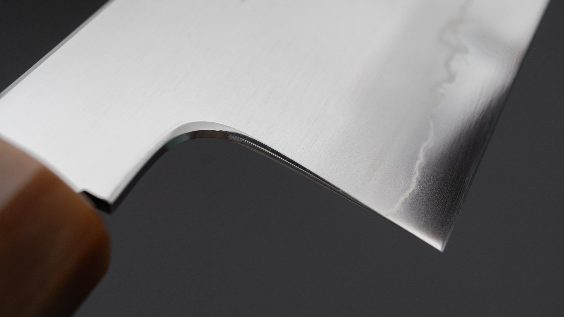 Myojin Sans sharpening is characterized by very even, thin convex (hamaguri) bevels, superior cutting performance, strong geometry and outstanding polish.