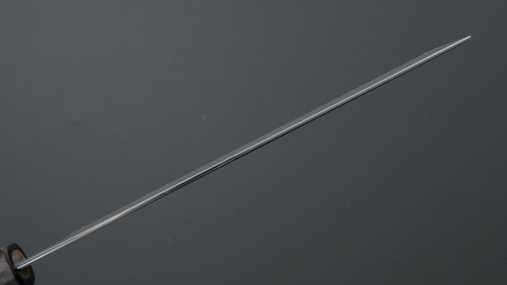 Kyuzo is a sharpener from Sakai. Son of one of the busiest sharpeners in this region and student of one of the most legendary and influential sharpeners. His style is a combination of these two teachings and is most known for this wide-bevel sharpening with a crisp and visible shinogi line. An extremely challenging way of grinding where symmetry is the most important factor. Kyuzo’s blades are characterized by their exceptional cutting performance and easy to maintain bevels. These pronounced wide bevels are easy to follow when thinning the blade resulting in better performance over time. In addition to the high level grind and sharpening these knives feature comfortably chamfered spine and choil increasing the overall quality of the blade.