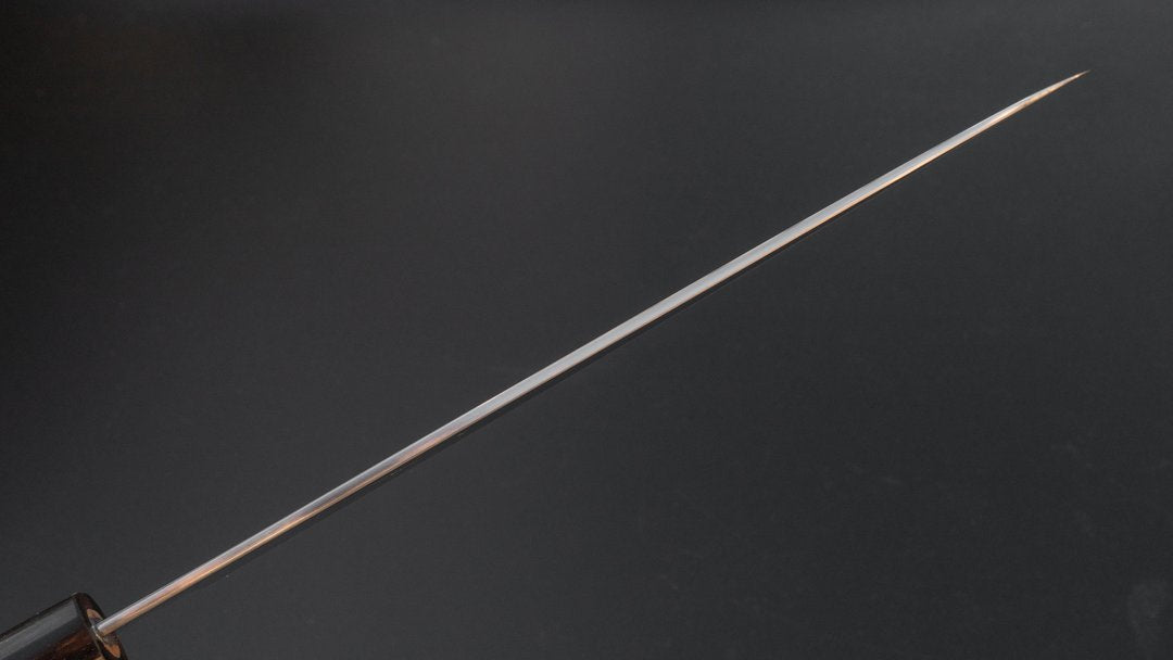 Kyuzo is a sharpener from Sakai. Son of one of the busiest sharpeners in this region and student of one of the most legendary and influential sharpeners. His style is a combination of these two teachings and is most known for this wide-bevel sharpening with a crisp and visible shinogi line. An extremely challenging way of grinding where symmetry is the most important factor. Kyuzo’s blades are characterized by their exceptional cutting performance and easy to maintain bevels. These pronounced wide bevels are easy to follow when thinning the blade resulting in better performance over time. In addition to the high level grind and sharpening these knives feature comfortably chamfered spine and choil increasing the overall quality of the blade.