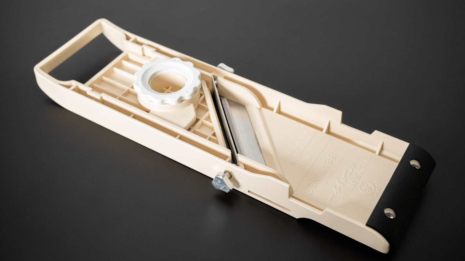 The Benriner mandoline is used for quickly slicing vegetables and cutting julienne strips. Thickness is easily adjusted with the screw underneath. The hand guard protects the fingers and holds the vegetable securely. A rubber foot prevents slipping, and it can rest on the edge of a bowl so slices fall directly inside. It includes three julienne blades (fine, medium, and coarse). Not dishwasher-safe.